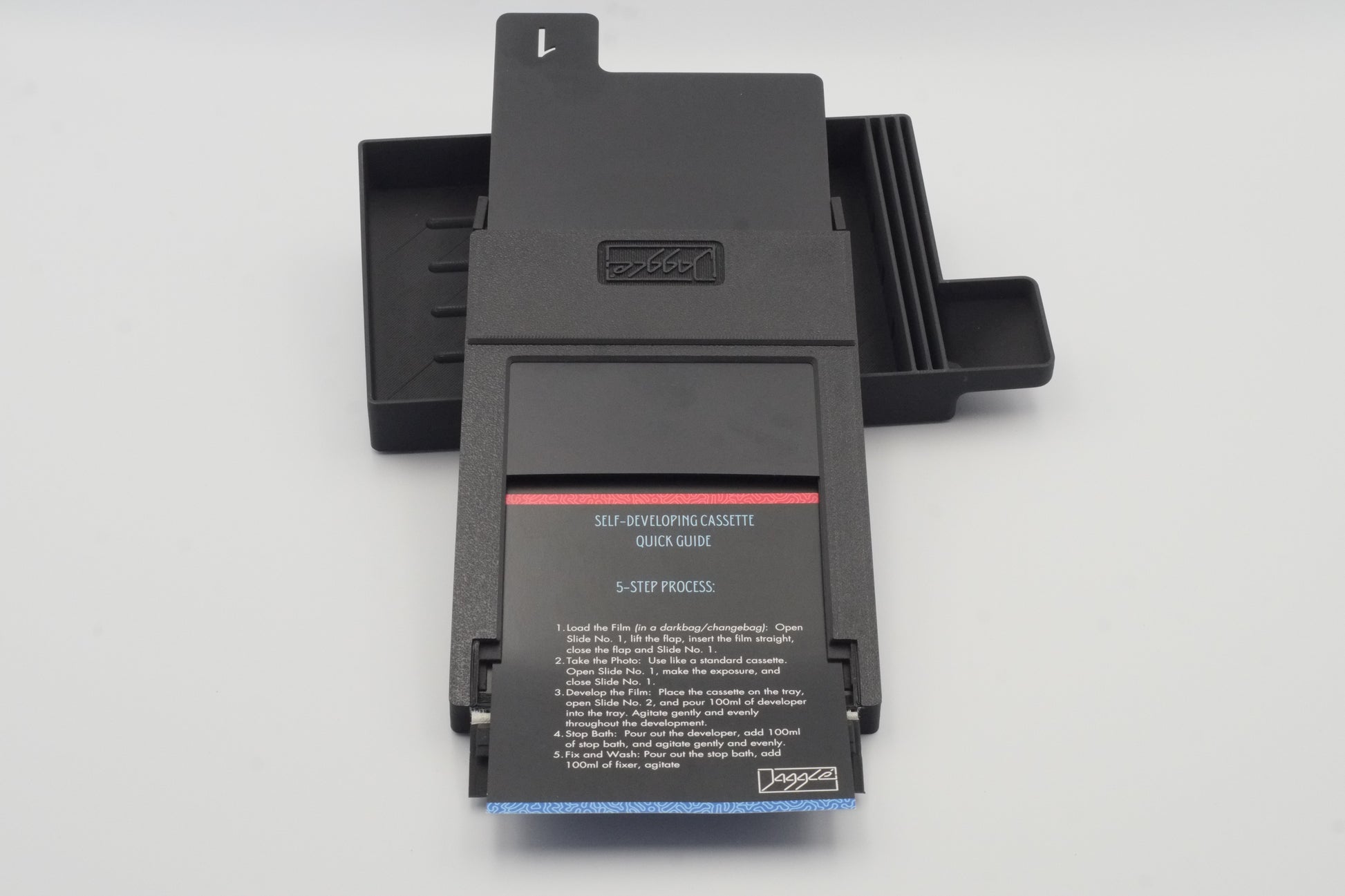Place the cassette on the tray, open Slide No. 2, and pour 100ml of developer into the tray. Agitate gently and evenly throughout the development.